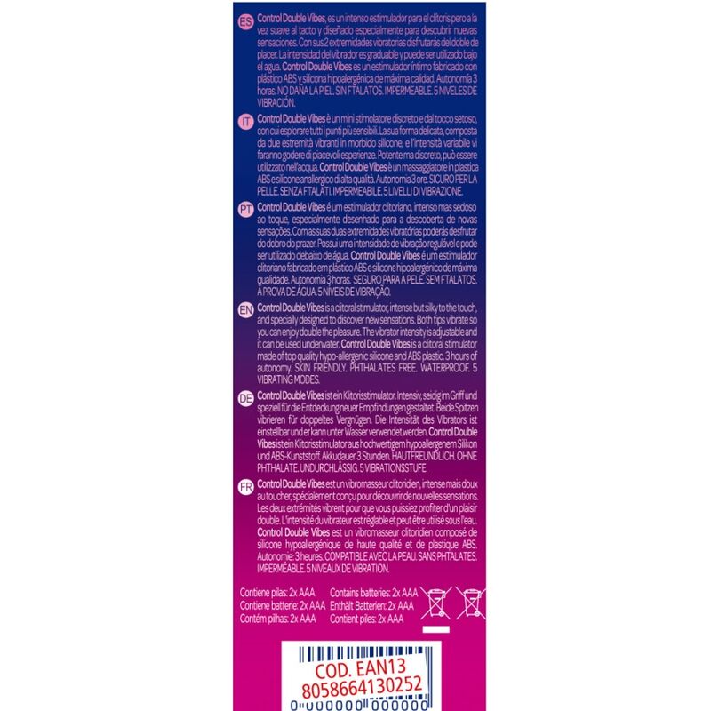 With its 2 vibrating limbs you will enjoy double the pleasure. The intensity of the vibrator is adjustable and can be used underwater. Control Double Vibes is an intimate stimulator made with ABS plastic and hypoallergenic silicone of the highest quality.