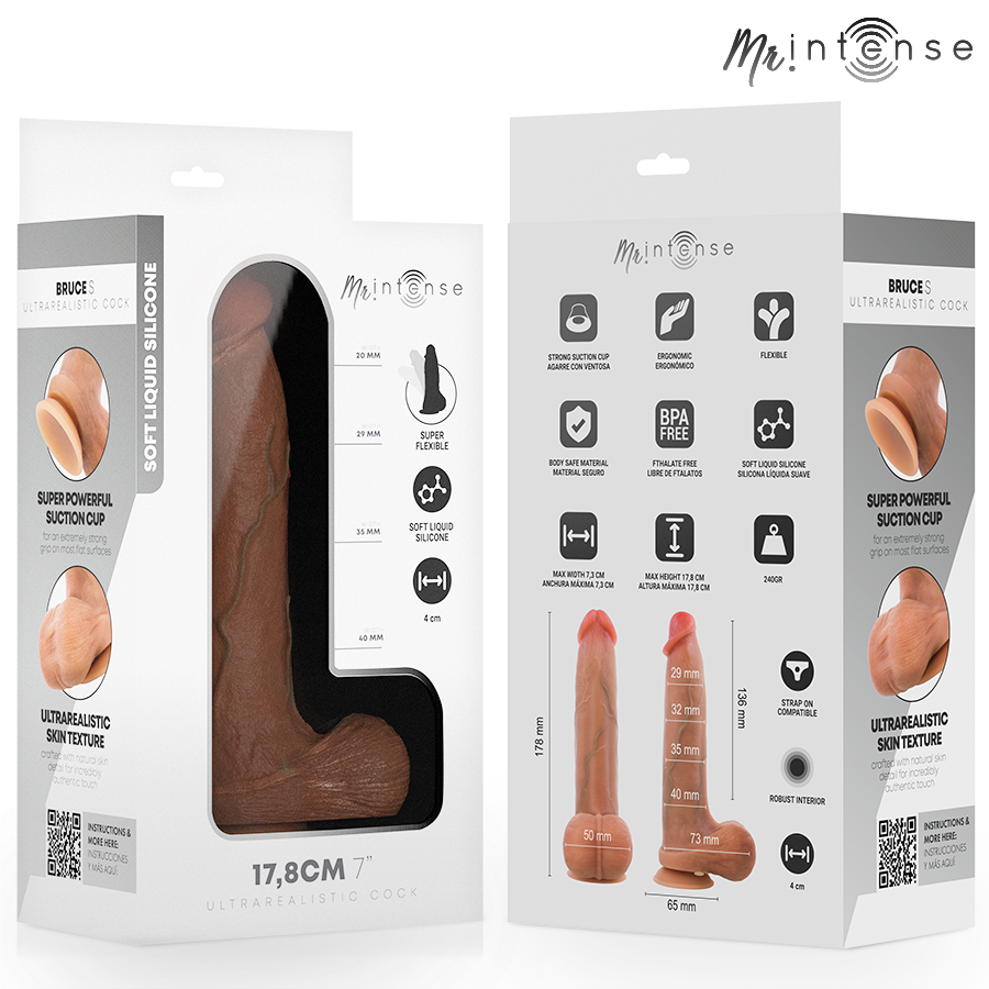 Com um comprimento total de 17,8 cm e um diâmetro progressivo que chega a 4 cm , o MR INTENSE - Bruce S foi projetado para experiências profundas, estáveis e totalmente satisfatórias. Sua base com ventosa potente permite o uso sem as mãos em superfícies lisas e é compatível com strap-on , ampliando as possibilidades de uso. Uma escolha ideal para quem exige o máximo realismo, sensações intensas e um design premium criado para prazer ilimitado.